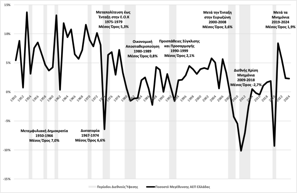 Ο μέσος ετήσιος ρυθμός μεγέθυνσης του ΑΕΠ στην 25ετία πριν τη μεταπολίτευση ήταν 6,9%. Στην πρώτη 25ετία μετά τη μεταπολίτευση μειώθηκε στο 2,2% και στην επόμενη 25ετία, μετά και την ένταξη στην ζώνη του ευρώ, μειώθηκε ακόμη περισσότερο, στο 0,6%.