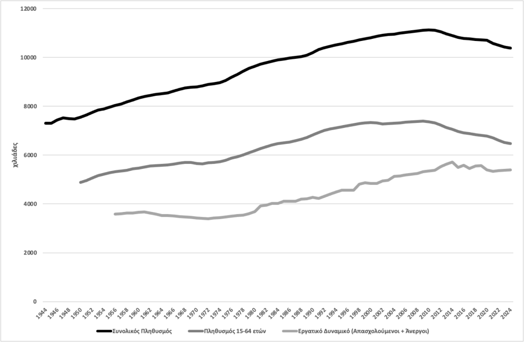 Η εξέλιξη του πληθυσμού της Ελλάδας παρίσταται στο Γράφημα 1. Ο πληθυσμός της Ελλάδας παρουσίαζε αύξηση έως το 2010. Από 7,3 εκατομμύρια το 1944, το 2010 είχε αυξηθεί στα 11,1 εκατομμύρια κατοίκους. Η μέση ετήσια αύξηση του συνολικού πληθυσμού στην περίοδο αυτή ήταν 0,64%. Μετά το 2010 ο ελληνικός πληθυσμός αρχίζει να μειώνεται. Το 2024 υπολογίζεται να έχει διαμορφωθεί στα 10,4 εκατομμύρια κατοίκους.