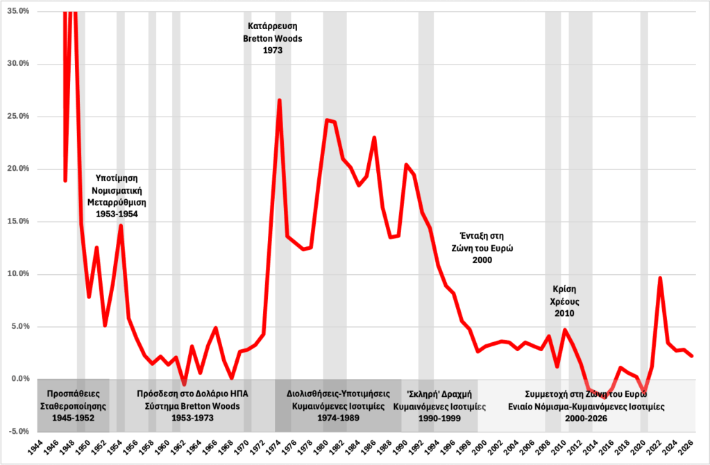 Μετά την ένταξη της Ελλάδος στη ζώνη του ευρώ, ο πληθωρισμός έχει παραμείνει σε πολύ χαμηλά επίπεδα. Στη δεκαετία 2000-2010, ο μέσος ετήσιος πληθωρισμός διαμορφώθηκε στο 3,2%, και μετά την κρίση, έπεσε ακόμη περισσότερο, στο 0,7% στην περίοδο 2010-2019. Υπήρξαν δε περίοδοι, όπως η τετραετία 2013-2016, που ο μέσος ετήσιος πληθωρισμός ήταν αρνητικός, στο -1,2%. Η προσωρινή αύξηση του πληθωρισμού κατά το 2022 οφείλεται στην αύξηση του διεθνούς πληθωρισμού και ήδη έχει αντιστραφεί.