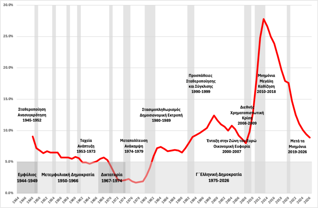 Μετά τη μεταπολίτευση, και κυρίως μετά το δεύτερο πετρελαϊκό σοκ και την ένταξη στην Ε.Ε, τότε Ε.Ο.Κ, οι οικονομικές επιδόσεις της Ελλάδας επιδεινώθηκαν. Οικονομική στασιμότητα ή χαμηλοί ρυθμοί οικονομικής μεγέθυνσης, υψηλός πληθωρισμός, άνοδος της ανεργίας και περιοδικές κρίσεις στο εξωτερικό ισοζύγιο. Μετά την ένταξη στη ζώνη του ευρώ, υπήρξε μία περίοδος οικονομικής ανάκαμψης, η οποία όμως συνδυάστηκε με πρωτοφανή επιδείνωση του εξωτερικού ισοζυγίου και αύξηση του δανεισμού από το εξωτερικό. Οι εξωτερικές και δημοσιονομικές ανισορροπίες επιδεινώθηκαν μετά το ξέσπασμα της διεθνούς χρηματοπιστωτικής κρίσης το 2008 και τη μεγάλη διεθνή ύφεση που προκλήθηκε. Έτσι, η Ελλάδα οδηγήθηκε στην κρίση χρέους του 2010, τα προγράμματα ΄διάσωσης΄, τα ΄μνημόνια΄και τη μεγάλη καθίζηση.