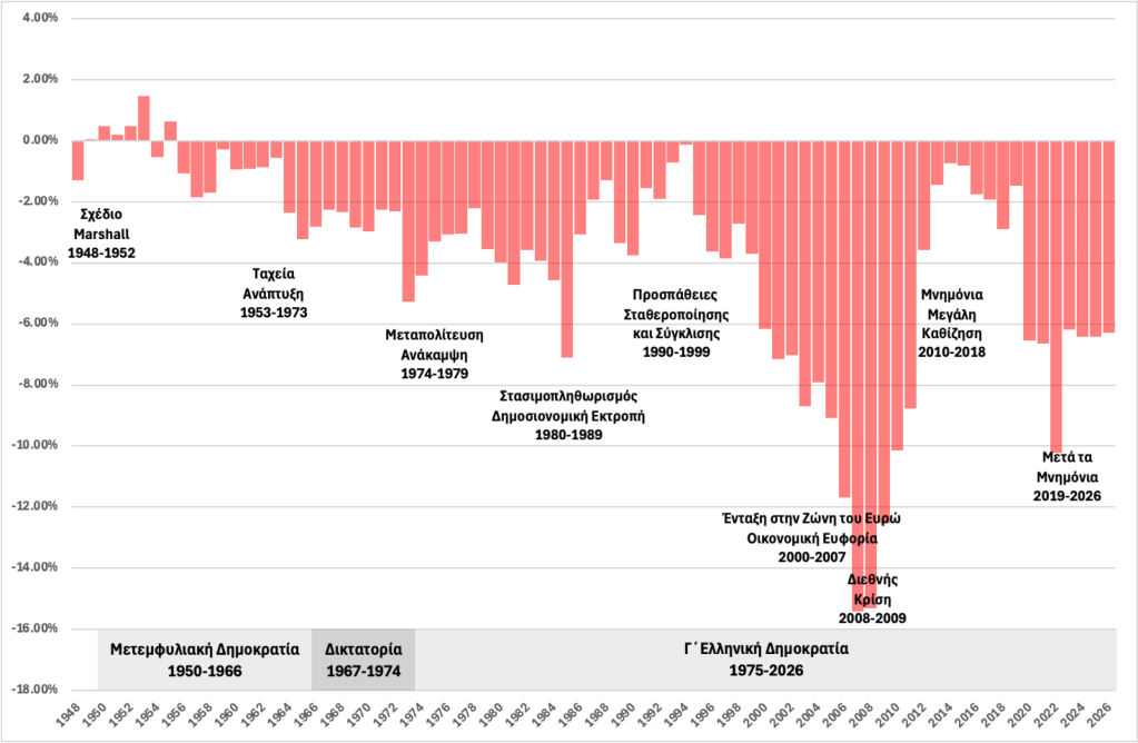 Στο σύνολο της περιόδου 1980-2024 ο μέσος ετήσιος ρυθμός μεγέθυνσης του πραγματικού ΑΕΠ διαμορφώθηκε μόλις στο 1,0%, όπως και τον 19ο αιώνα.