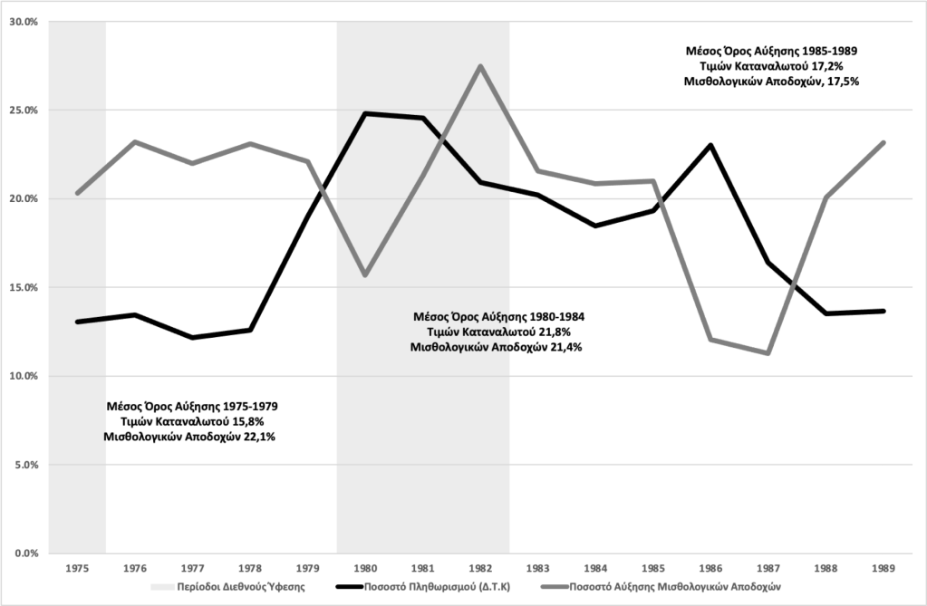 Ο πληθωρισμός μονιμοποιήθηκε σε επίπεδα της τάξης του 20%, αν και υπήρξε κάποια τάση αποκλιμάκωσης του προς το τέλος της δεκαετίας. Οι σχετικές εξελίξεις αποτυπώνονται στο Γράφημα 2. Ενώ ο μέσος πληθωρισμός στις οικονομίες της ΕΕ-15 αποκλιμακώθηκε ήδη από το 1981, και ήδη από το 1983 βρισκόταν κάτω από το 5%, στην Ελλάδα ο πληθωρισμός παρέμεινε στα επίπεδα του 20% έως και το 1986. Λόγω του σταθεροποιητικού προγράμματος αποκλιμακώθηκε το 1987 και το 1988 αλλά μετά σταθεροποιήθηκε στα επίπεδα του 13,5%, υπερδιπλάσιος από τα μέσα επίπεδα στην ΕΕ-15.