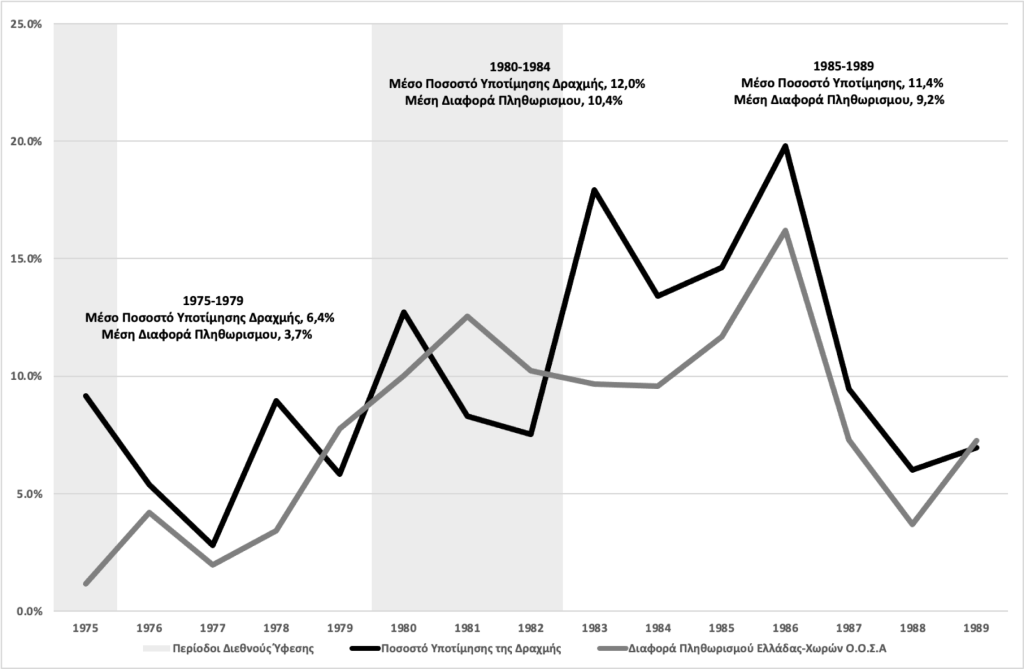 Ωστόσο, ο πληθωρισμός μονιμοποιήθηκε σε υψηλά επίπεδα κυρίως μετά τη δεύτερη πετρελαϊκή κρίση, βοηθούμενος από την καθιέρωση της ΑΤΑ και την ακόμη ταχύτερη διολίσθηση της ισοτιμίας της δραχμής, για μεγάλο μέρος της δεκαετίας του 1980. Σε συνδυασμό με τις εξελίξεις στην αγορά εργασίας, ο φαύλος κύκλος μισθολογικών αυξήσεων και πληθωρισμού, οδηγούσε σε κύκλους διολίσθησης ή και υποτίμησης, περαιτέρω αύξηση του πληθωρισμού, νέες μισθολογικές αυξήσεις και τανάπαλιν. Η σχέση μεταξύ της πολιτικής της διολίσθησης και της θετικής διαφοράς πληθωρισμού μεταξύ της Ελλάδας και των εμπορικών της εταίρων στον ΟΟΣΑ απεικονίζεται στο Γράφημα 8.