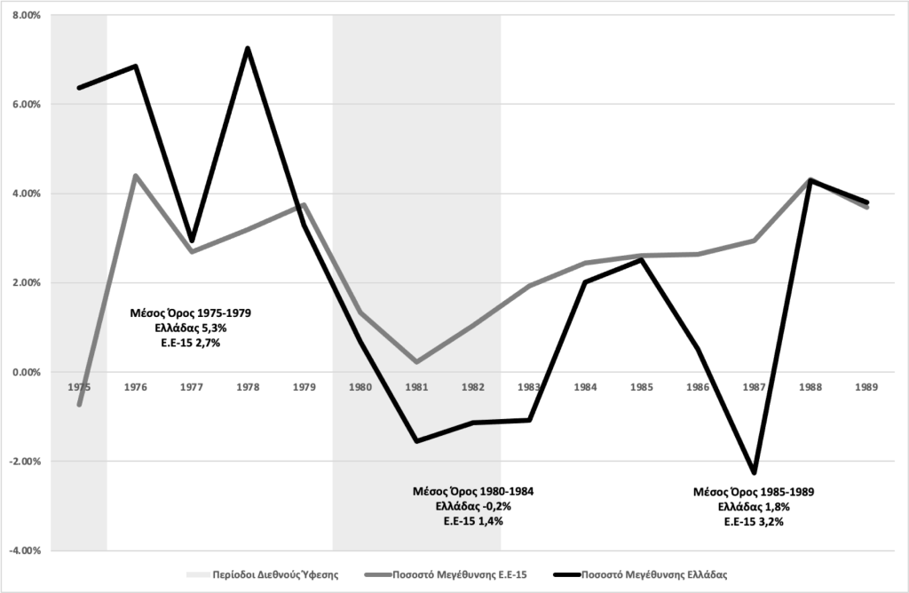 Ο ρυθμός μεγέθυνσης του πραγματικού ΑΕΠ παρέμεινε αρνητικός έως και το 1983, και η ανάκαμψη υπήρξε ιδιαίτερα αναιμική. Ο μέσος ετήσιος ρυθμός μεγέθυνσης του ΑΕΠ στη δεκαετία του 1980 ήταν μόλις 0,8%, έναντι 5,3% στην πενταετία 1975-1979. Επιπλέον, τα περισσότερα χρόνια ήταν σημαντικά χαμηλότερος από το μέσο ρυθμό μεγέθυνσης στην ΕΕ-15, όπως φαίνεται και στο Γράφημα 1. Αυτό οδήγησε σε σημαντική απόκλιση του ελληνικού κατά κεφαλήν ΑΕΠ σε σχέση με αυτό των πιο αναπτυγμένων οικονομιών της ΕΕ-15.