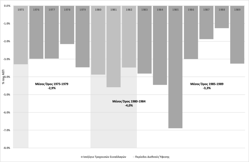 Παρά την πολιτική της συνεχούς διολίσθησης της ισοτιμίας του νομίσματος, τόσο το 1983 όσο και το 1985 υπήρξαν κρίσεις στο ισοζύγιο πληρωμών, οι οποίες οδήγησαν και σε σημαντικές εφάπαξ υποτιμήσεις της δραχμής. Παρά τις υποτιμήσεις, το μέσο έλλειμμα του ισοζυγίου τρεχουσών συναλλαγών διαμορφώθηκε στη δεκαετία 1980-1989 στο 3,7% του ΑΕΠ, έναντι 2,9% του ΑΕΠ στην πενταετία 1975-1979. Βλ. Γράφημα 4.