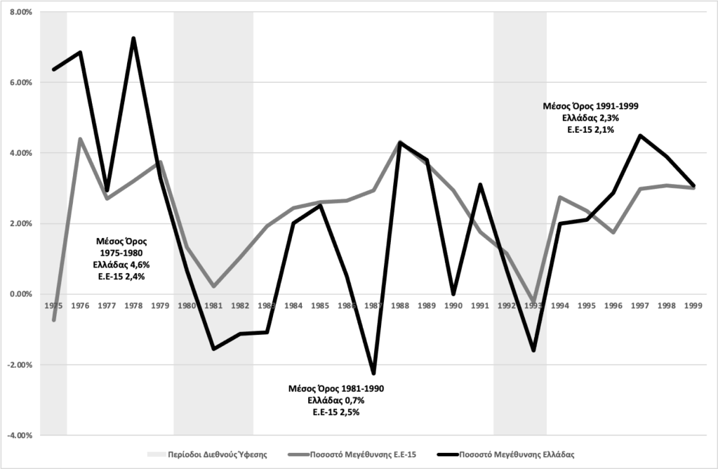 Ο μέσος ετήσιος ρυθμός μεγέθυνσης του ΑΕΠ στη περίοδο 1991-1999 διαμορφώθηκε στο 2,3%, έναντι 0,7% στη δεκαετία 1981-1990, καθώς μετά τη διεθνή ύφεση του 1993 υπήρξε ανάκαμψη του ρυθμού μεγέθυνσης. Στα τέλη της δεκαετίας του 1990 το μέσο ποσοστό μεγέθυνσης της Ελλάδας ξεπέρασε τον μέσο ρυθμό μεγέθυνσης της Ε.Ε των 15, για πρώτη φορά από τα τέλη της δεκαετίας του 1970. Η εξέλιξη αυτή απεικονίζεται στο γράφημα που ακολουθεί.