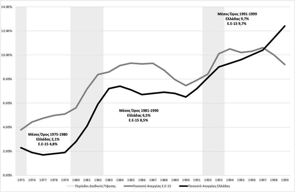 Στα τέλη της δεκαετίας του 1990 το ποσοστό ανεργίας στην Ελλάδα ξεπέρασε και τον μέσο όρο του ποσοστού ανεργίας στην Ε.Ε των 15.