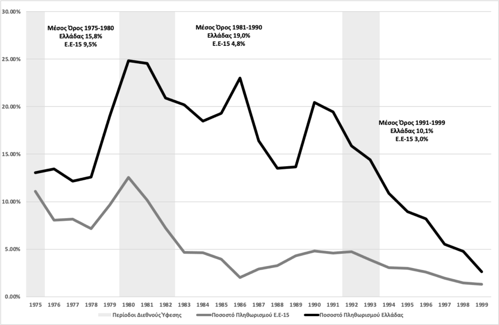 Διαφορά Πληθωρισμού Ελλάδος-Χωρών ΟΟΣΑ, 1975-1999