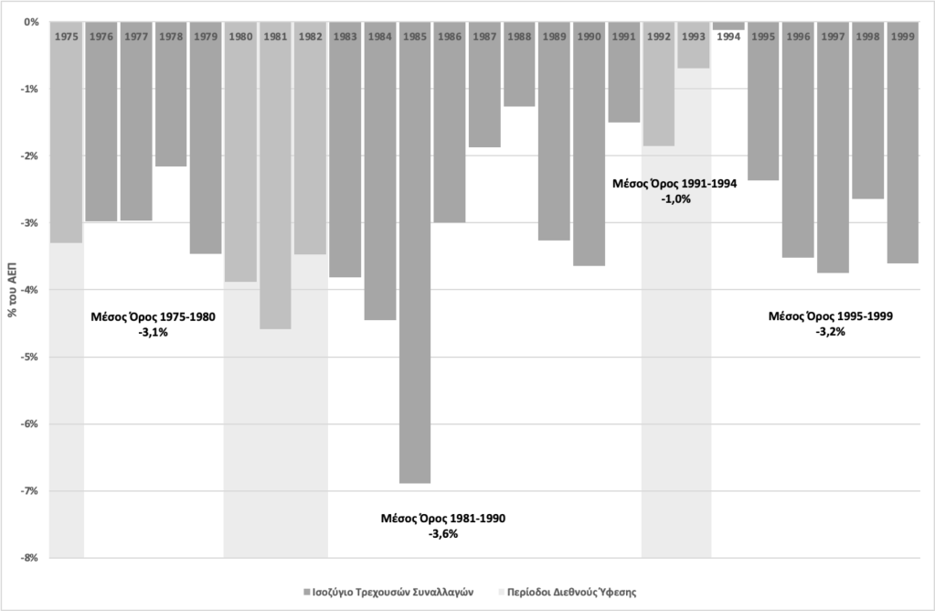 Το έλλειμμα του ισοζυγίου τρεχουσών συναλλαγών παρουσίασε δύο όψεις κατά τη δεκαετία του 1990.