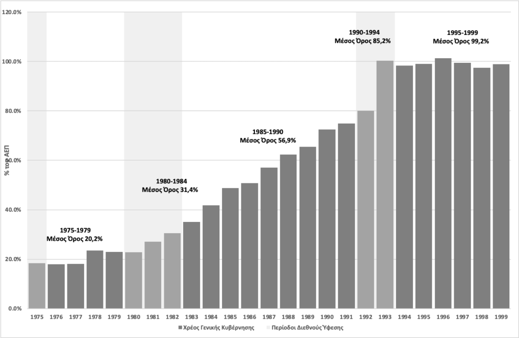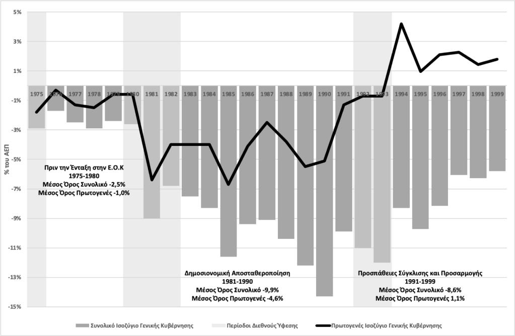 Στις αρχές της δεκαετίας του 1990 υπήρξε μία πολιτική σημαντικής δημοσιονομικής προσαρμογής η οποία μετέτρεψε τα μεγάλα πρωτογενή ελλείμματα της γενικής κυβέρνησης σε πρωτογενή πλεονάσματα. Ωστόσο, μετά το 1994, η πρωτογενής δημοσιονομική προσαρμογή ουσιαστικά σταμάτησε, και η πολιτική της σύγκλισης βασίστηκε σχεδόν αποκλειστικά στην περιοριστική νομισματική πολιτική και την πτώση του πληθωρισμού, μέσω της πολιτικής της ‘σκληρής’ δραχμής.