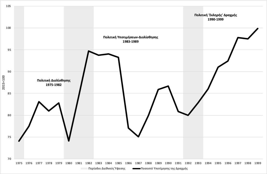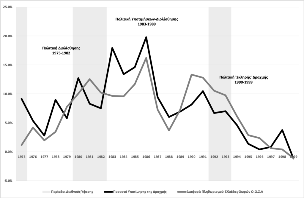 Αυτή οφείλεται κυρίως στη μεταστροφή της νομισματικής και συναλλαγματικής πολιτικής. Από την επεκτατική νομισματική πολιτική της δεκαετίας του 1980, η Ελλάδα, από τις αρχές της δεκαετίας του 1990 υιοθέτησε την πολιτική της ‘σκληρής’ δραχμής. Παράλληλα, με τη σταδιακή κατάργηση των ποσοτικών περιορισμών, απελευθερώθηκαν σταδιακά τόσο το εγχώριο πιστωτικό σύστημα, όσο και η κίνηση κεφαλαίων. Επιπλέον, μετά την υπογραφή της συνθήκης του Μααστρίχτ το 1991, καταργήθηκε η νομισματική χρηματοδότηση των δημοσιονομικών ελλειμμάτων από την Τράπεζα της Ελλάδος. Οι εξελίξεις αυτές οδήγησαν σε πολύ πιο περιοριστική νομισματική πολιτική και τον σταδιακό τερματισμό της πολιτικής της διολίσθησης και των περιοδικών υποτιμήσεων του νομίσματος έως την υποτίμηση του 1998. Από το 1990 έως το 1998 το μέσο ποσοστό υποτίμησης της δραχμής υπολειπόταν της διαφοράς πληθωρισμού μεταξύ της Ελλάδας και των χωρών του Ο.Ο.Σ.Α.
