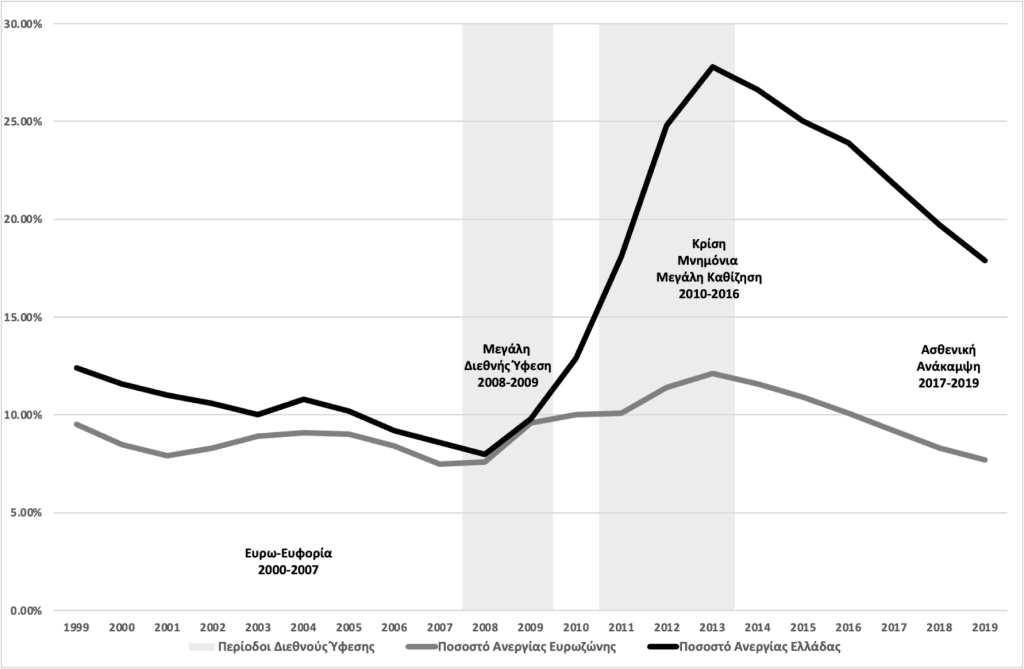 Το μέσο ετήσιο ποσοστό ανεργίας εκτινάχθηκε από το 7,6% του εργατικού δυναμικού το 2008 στο 27,5% το 2013. Έκτοτε ακολούθησε φθίνουσα πορεία, βοηθούσης και της μετανάστευσης, αλλά το μέσο ποσοστό ανεργίας στη δεκαετία 2010-2019 διαμορφώθηκε στο 21,6% του εργατικού δυναμικού, έναντι 9,7% στη δεκαετία του 2000. Το μέγιστο ποσοστό ανεργίας στη ζώνη του ευρώ διαμορφώθηκε στο 12%, το 2013, και έκτοτε έπεσε κάτω από το 10%.