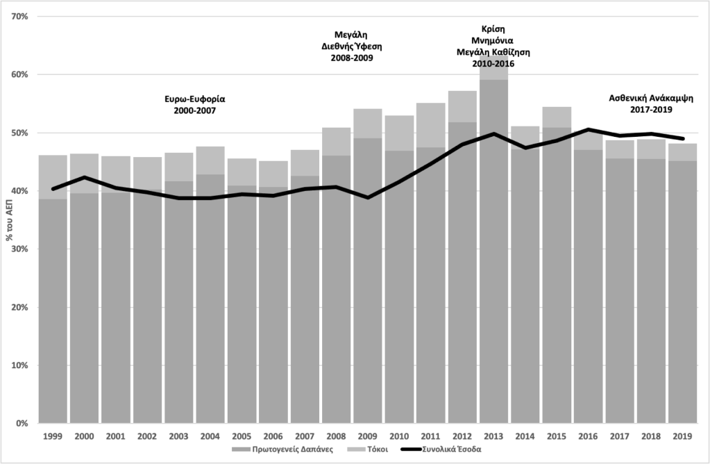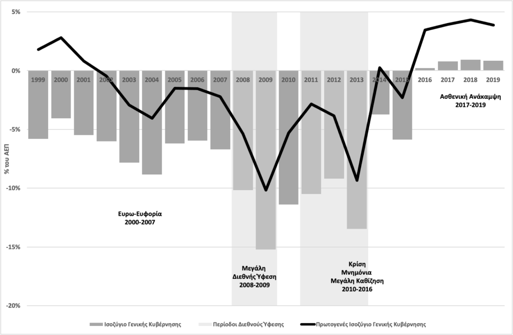 Χωρίς αμφιβολία η δημοσιονομική προσαρμογή υπήρξε μεγάλη. Το μεγαλύτερο της μέρος είχε συντελεστεί έως το 2014, όταν το έλλειμμα της γενικής κυβέρνησης είχε μειωθεί στο 3,6% του ΑΕΠ και υπήρξε ένα πρώτο μικρό πρωτογενές πλεόνασμα, 0,4% του ΑΕΠ. Τα δημόσια οικονομικά επιδεινώθηκαν στο εκλογικό 2015, λόγω και των πειραματισμών της κυβέρνησης Τσίπρα, αλλά μετά το 2016, με την εφαρμογή του τρίτου μνημονίου, η βελτίωση και συνεχίσθηκε και εντάθηκε.