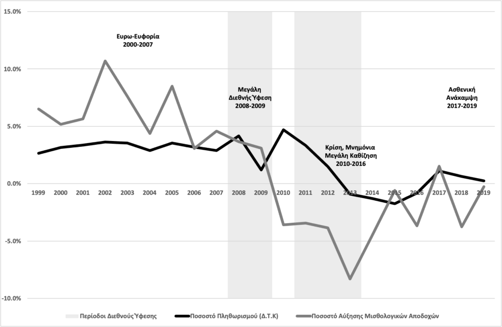 Όπως και στην περίπτωση της δημοσιονομικής προσαρμογής, το μεγαλύτερο μέρος της προσαρμογής των ονομαστικών και πραγματικών μισθών συνέβη στην πενταετία 2010-2014, όταν η μέση ετήσια μείωση των ονομαστικών μισθών ήταν 3,7% και των πραγματικών 4,0%. Μετά το 2015 η προσαρμογή των μισθών επιβραδύνθηκε, ενώ το 2018 υπήρξε μια μικρή πραγματική αύξηση των αποδοχών.
