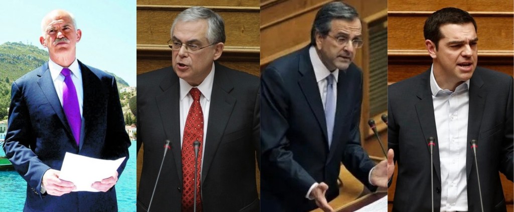 Μέσα σε οκτώ χρόνια, υπήρξαν πέντε διαδοχικές κυβερνήσεις, του Γιώργου Παπανδρέου (ΠΑ.ΣΟ.Κ), του πρώην κεντρικού τραπεζίτη Λουκά Παπαδήμου (συγκυβέρνηση ΠΑ.ΣΟ.Κ, Νέας Δημοκρατίας και Λ.Α.Ο.Σ), του Αντώνη Σαμαρά (συγκυβέρνηση Νέας Δημοκρατίας, ΠΑ.ΣΟ.Κ και, για ένα διάστημα, ΔΗΜ.ΑΡ) και δύο του Αλέξη Τσίπρα (συγκυβέρνηση ΣΥ.ΡΙ.ΖΑ και ΑΝ.ΕΛ).
